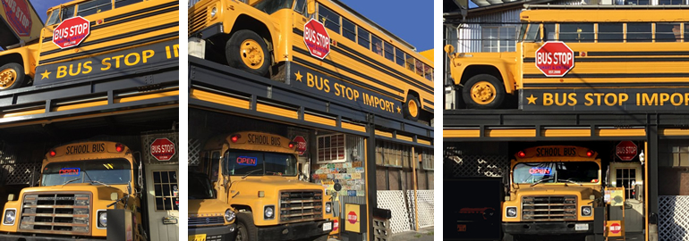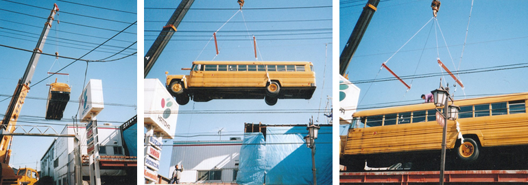 このバスはつい先日までLA市内の学校でスクールバスとして使われていたものを購入後、ロングビーチ港まで走り、大型フェリー船に乗せられ横浜港に到着。通関を終え、バス2台連ねてベイブリッジとレインボーブリッジを渡り、首都高速を通って川口まで自走してきました。 |