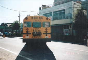 | このバスはつい先日までLA市内の学校でスクールバスとして使われていたものを購入後、ロングビーチ港まで走り、大型フェリー船に乗せられ横浜港に到着。通関を終え、バス2台連ねてベイブリッジとレインボーブリッジを渡り、首都高速を通って川口まで自走してきました。 |